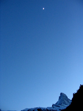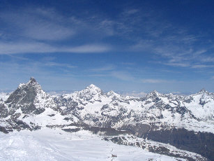The "Haute Route" is a number of hut to hut and peak to peak routes between Chamonix (Mont Blanc) France and Zermatt (Matterhorn)/Saas Fee Switzerland. The Haute Route is the "classic" ski mountaineering tour as it encompasses 4,000 meter peaks, high passes, glacier skiing, ski ascents, and just about every snow /weather combination imagineable...In April 2004, I had the good fortune to add the "Haute Route" to my list of "gonzo abusive" adventures that I have survived! A memorable trip for its mountains, skiing , old friends and new acquaintences. Ruedi Beglinger insured that the adventure was maximized! Skins-on and Berg Heil!