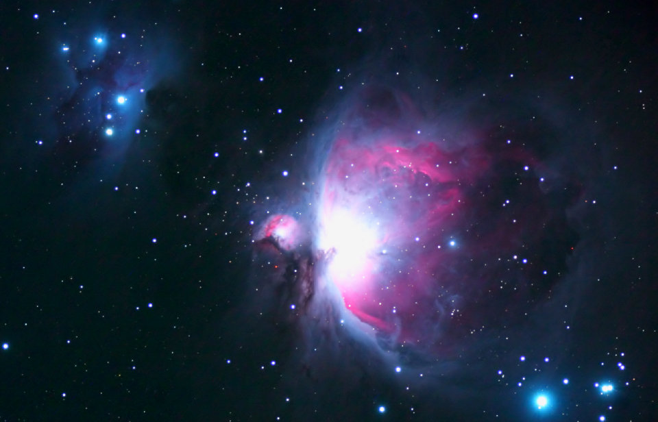 Orion Nebula M42: justifiably one of the sky's most famous deep sky objects! The Orion Nebula is found in the sword of the constellation Orion. It is a bright and a beautiful sight in most any telescopes. The nebula in the upper left corner is known as the "running man nebula". M42 is a stellar nursery 1,500 light years away. This photo was taken in Colorado Springs in Feb 2005. Pentax 105 SHDF at f /6.7 with a Canon 10D, 7x180sec exposures.