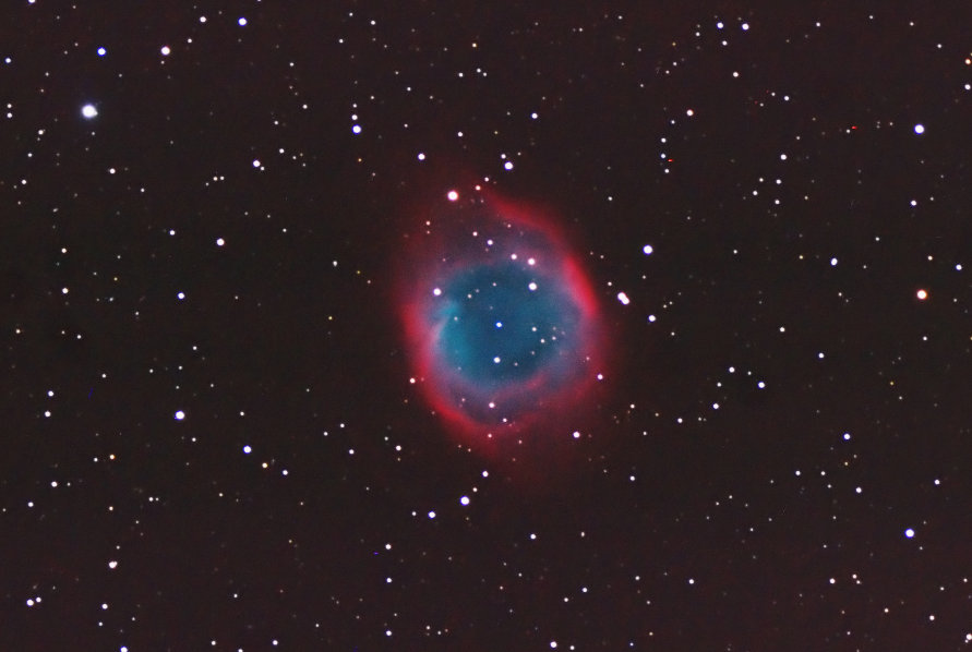 Helix Nebula, NGC 7293. This is an enormous planetary nebula-it measures 12' in diameter which is very large for a planetary nebula. The famous Ring Nebula is 2.5' in diameter. The Helix is very faint but a beautiful photographic object. Summit County, Pentax 105 SHDF, 60 min.