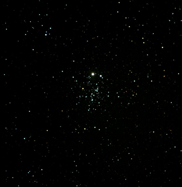 "E.T." Cluster NGC 457 Cassiopeia. This cluster is easy to find high in the northern sky during fall evenings. It has a controversial distance of 2,100 to 10,400 light years away in the Perseus arm of the Milky Way. To many observers, the cluster resembles the "E.T." of the 1982 Spielberg film "E.T. The Extra-Terrestial".....funny effects cold evenings have....Canon 10D, Brandon 130 f/8 apo refractor, Colorado Springs, Dec 2004
