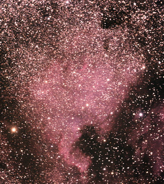 The North America Nebula lies in the constellation Cygnus (the Swan). It spans a large 11/2 degree swath and is some 50 light years across. The "Gulf of Mexico" is fairly distinctive and then a lot of imagination is needed! The nebula is a HII emission nebula that is illuminated by one or more stars. Pentax 105SHDF APO with TV 0.8x reducer, Canon 10D, October 2004, Summit County, CO.