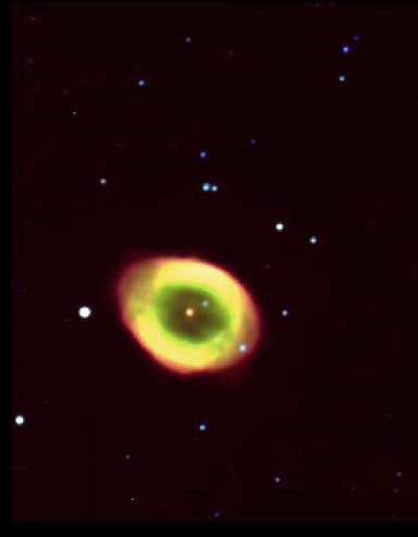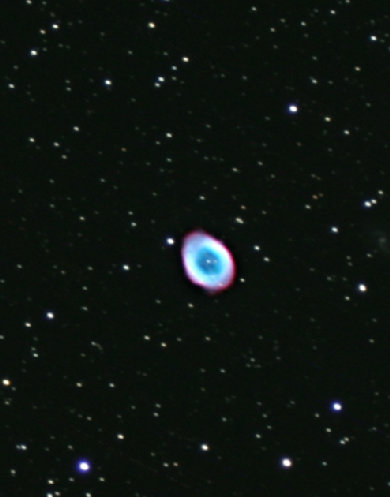 The Ring Nebula M57. The Ring Nebula is a "planetary nebula"- the ionized gas expelled from a star 1-6 X mass of the sun. The aging star that remains is a hot white dwarf. The Ring is 1,140 light years from earth. Left hand photo was taken with a research grade CCD camera at University of Arizona's Mt Lemmon Observatory with a 36" reflector during "Astronomy Camp" in April 2000. The Right side photo is the result of 12 X1 minute exposures with a Canon 10D and a 6" refractor in Summit County on July 12, 2004.